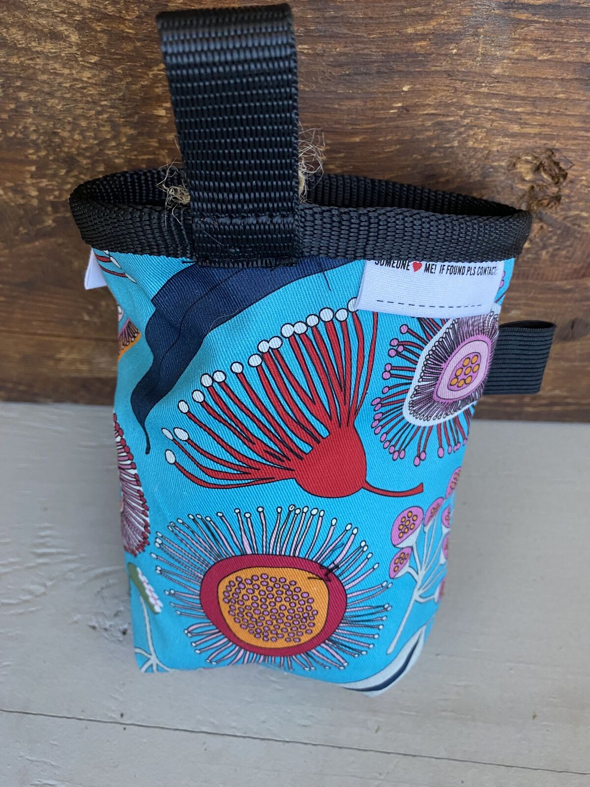 Material: Cotton fabric, fleece, nylon webbing and string, toggle.