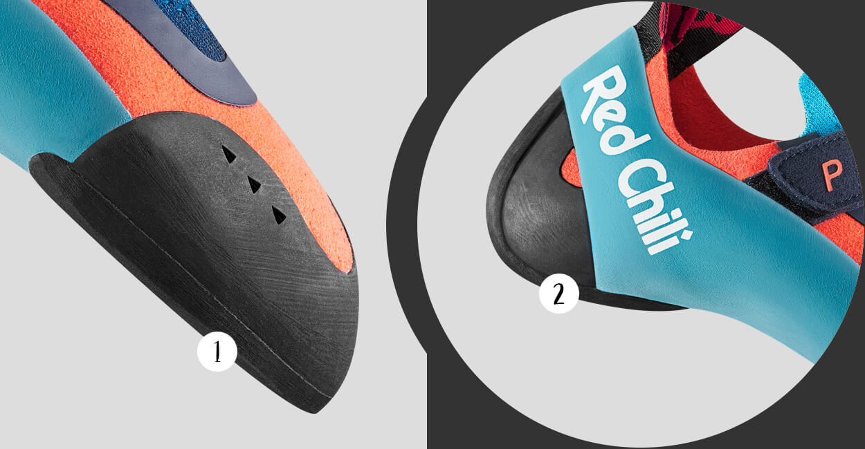 The PUZZLE is very soft and flexible, thereby promoting young people's natural stepping behavior of "grabbing" footholds with the feet. This natural "claw effect" is supported by a (1) slightly deeper rand in the toe area. At the same time, a moderate downturn provides sufficient pre-tensioning to pull on even small grips on overhangs.
